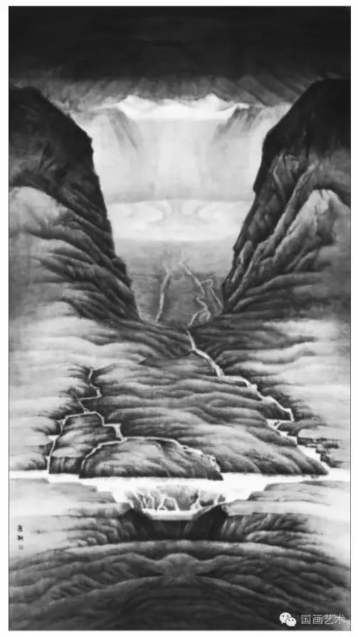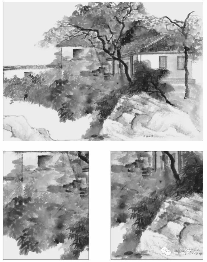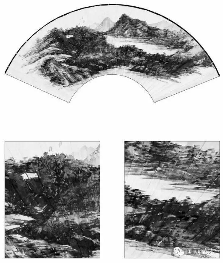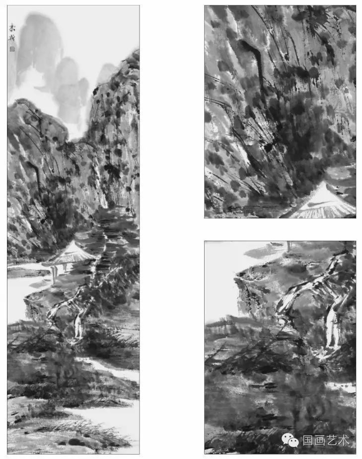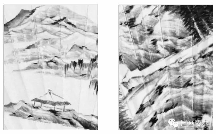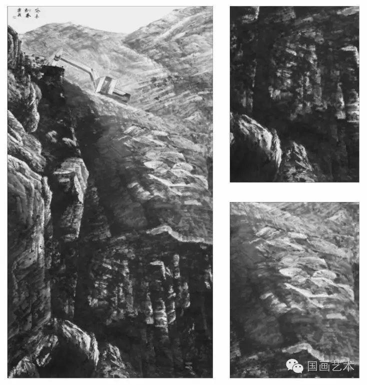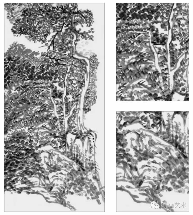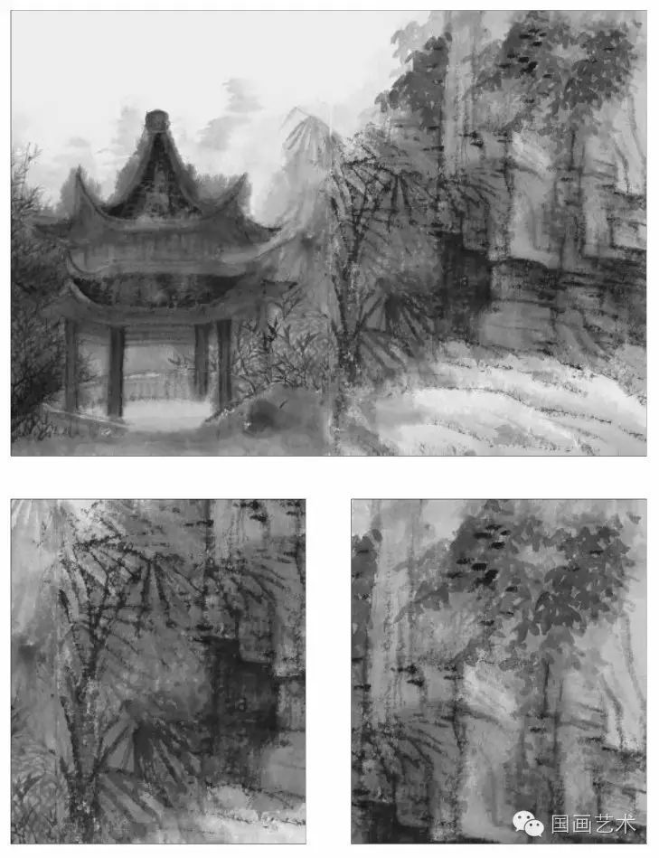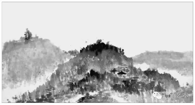 积墨法:墨色由淡到深一层一层地叠加式加深,其目的是充分表现山石的结构、凹凸、阴阳和层次,使画面产生坚实厚重的效果。用积墨法是为了更好地表现对象,不能为积墨而积墨,将主次关系搞颠倒了。